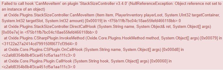 (22:26:18) | [Oxide] 22:26 [Error] Failed to call hook 'CanMoveItem' on plugin 'StackSizeController v3.4.1' (NullReferenceException: Object reference not set to an instance of an object)